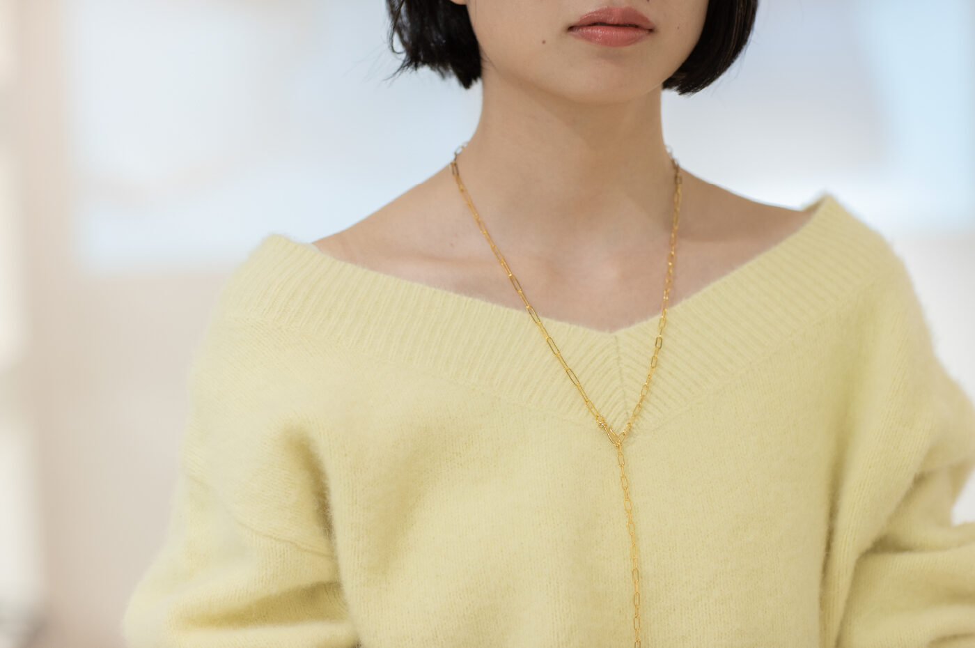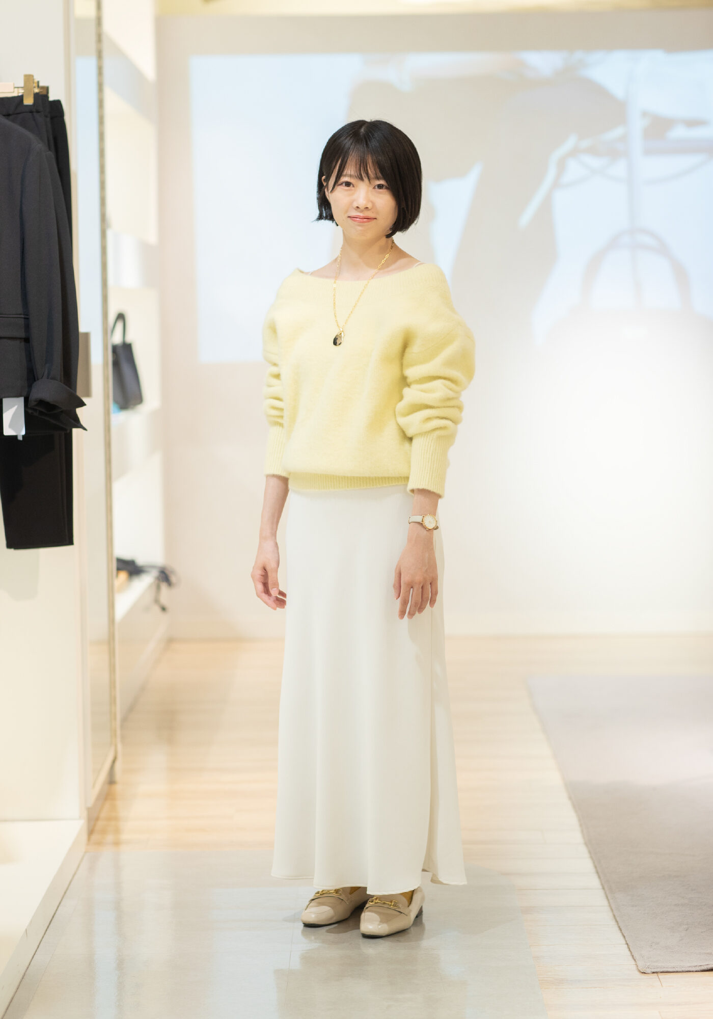 ふわっと明るく冬に映えるミルキーカラー。顔まわりも明るくなる淡い黄色のふわふわニットは、白のIラインスカートで大人っぽく着こなすと good バランス✔️