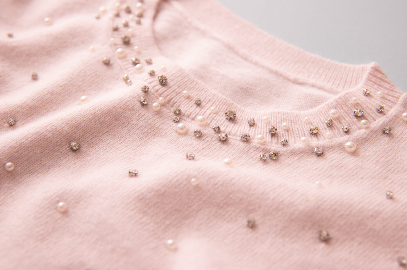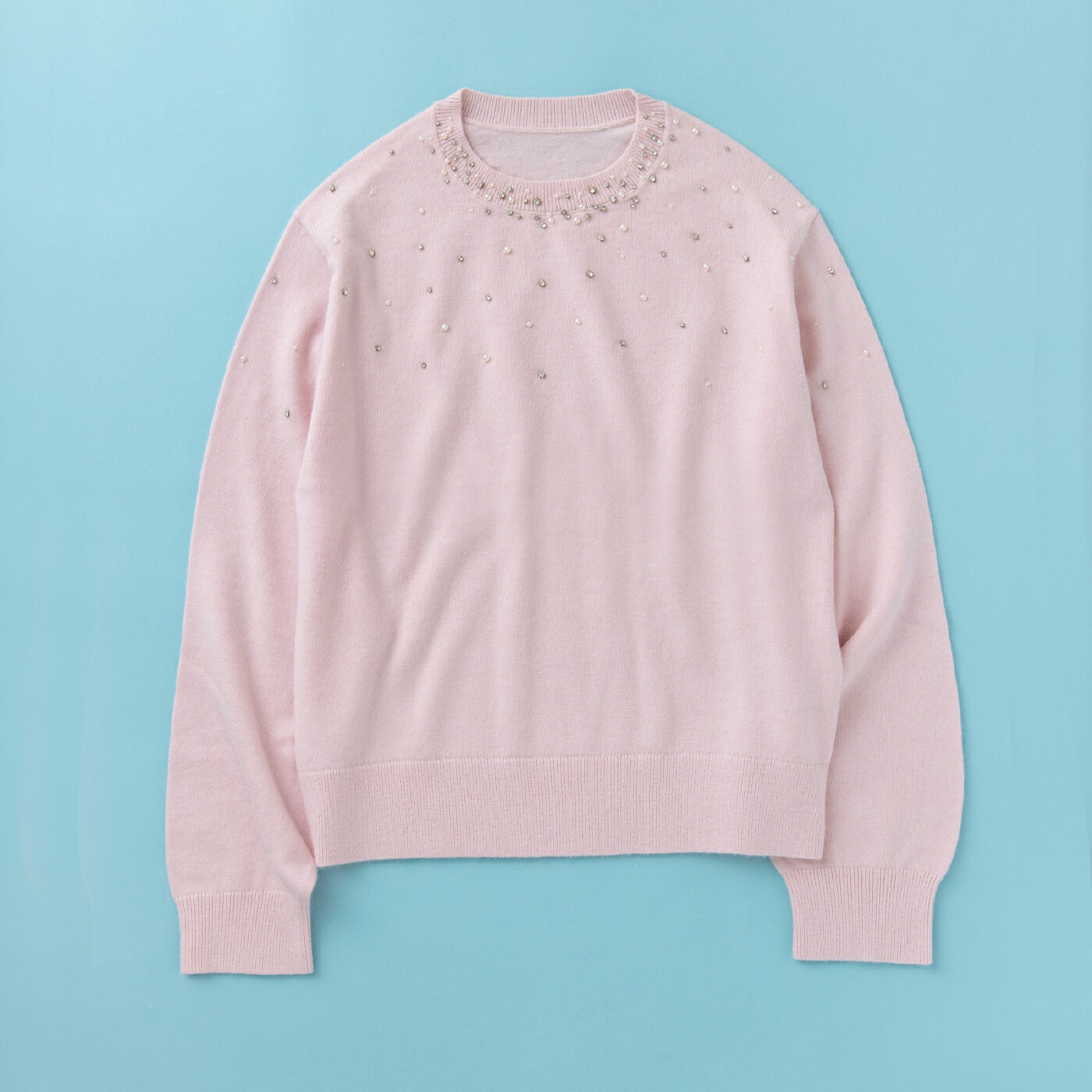 華やかなビジューが顔周りを明るくするピンクニット。やわらか素材で着心地も抜群です🎀