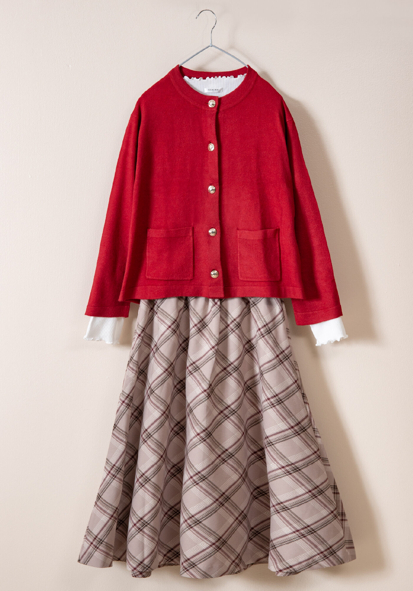 明るい赤色もカーディガンなら着回しやすい◎ ぜひ持っておきたい一着です💡