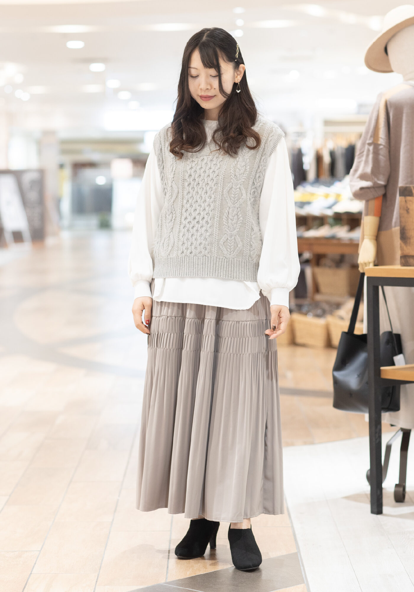 落ち感のあるブラウス、細かいプリーツが軽やかなスカートも相性抜群です✍️