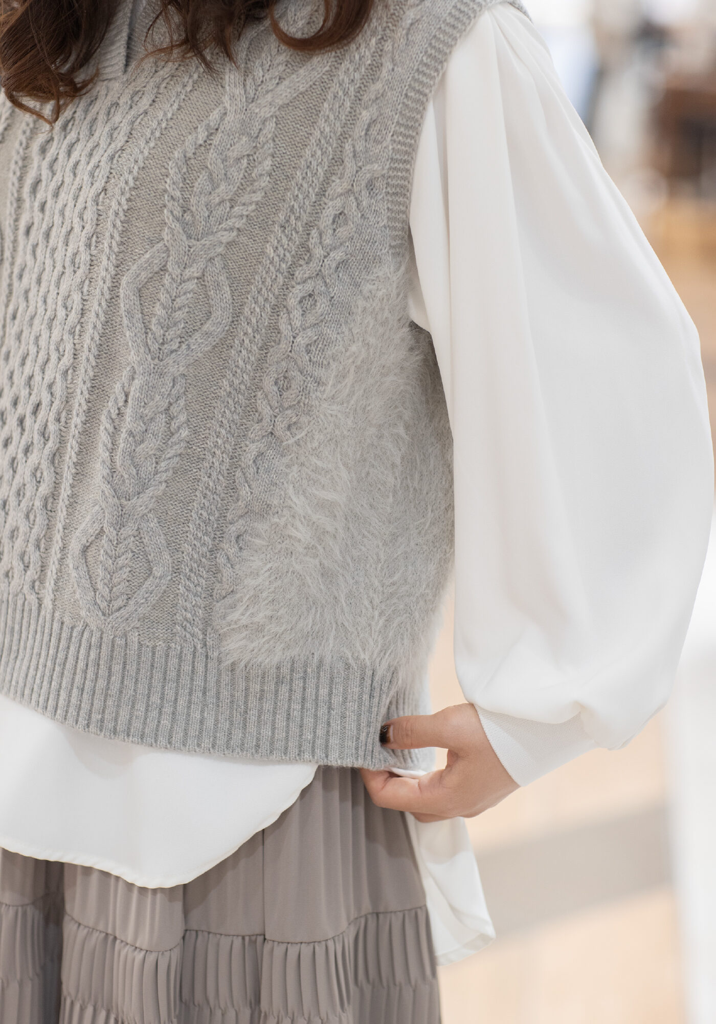 ニット×ファーの異素材ミックスベストで個性を出して✔️