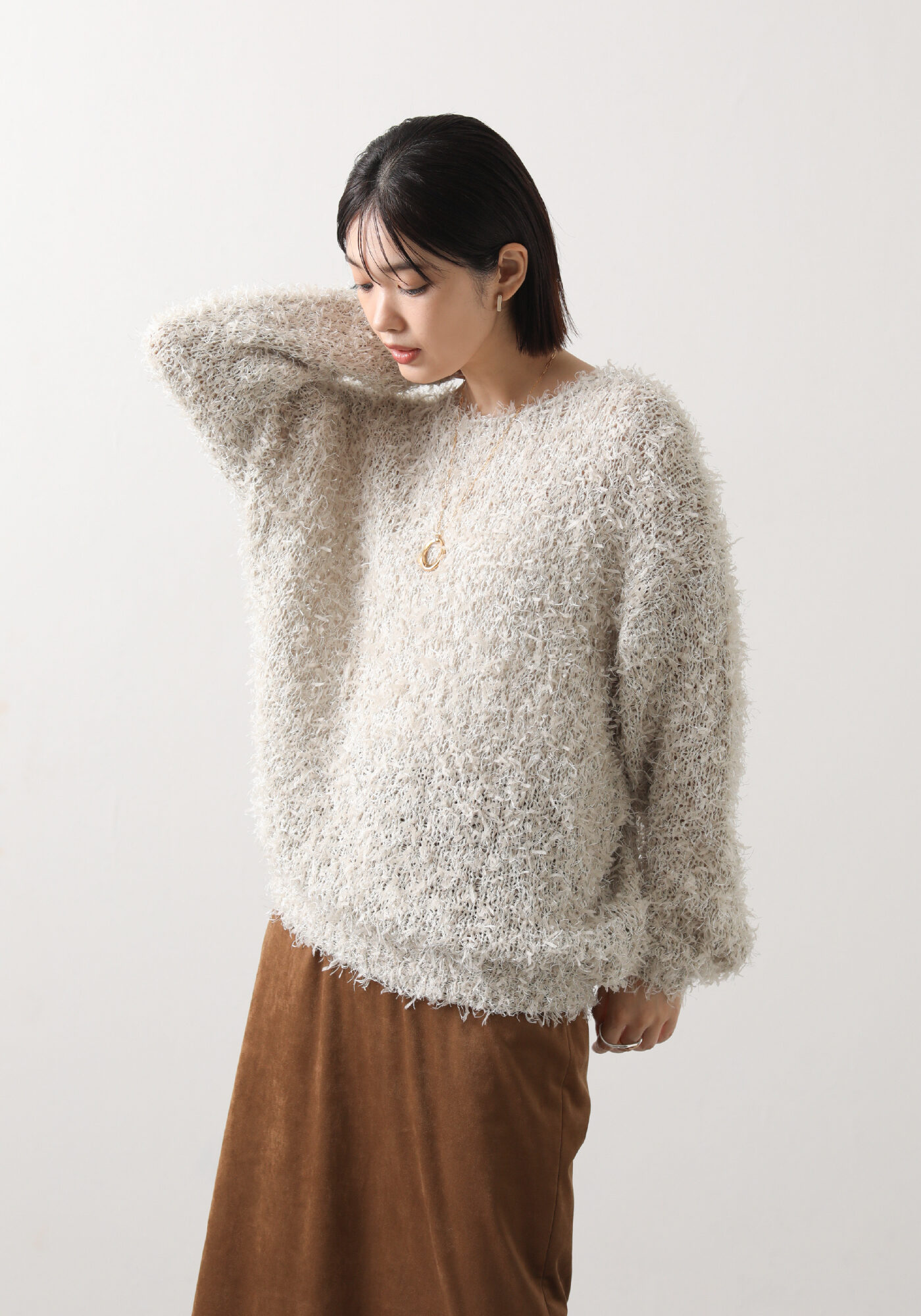 トレンドのリボンヤーンを使用したボートネックニット。首元がすっきりしているので、シャツやタートルとのレイヤードも自在です🙌
