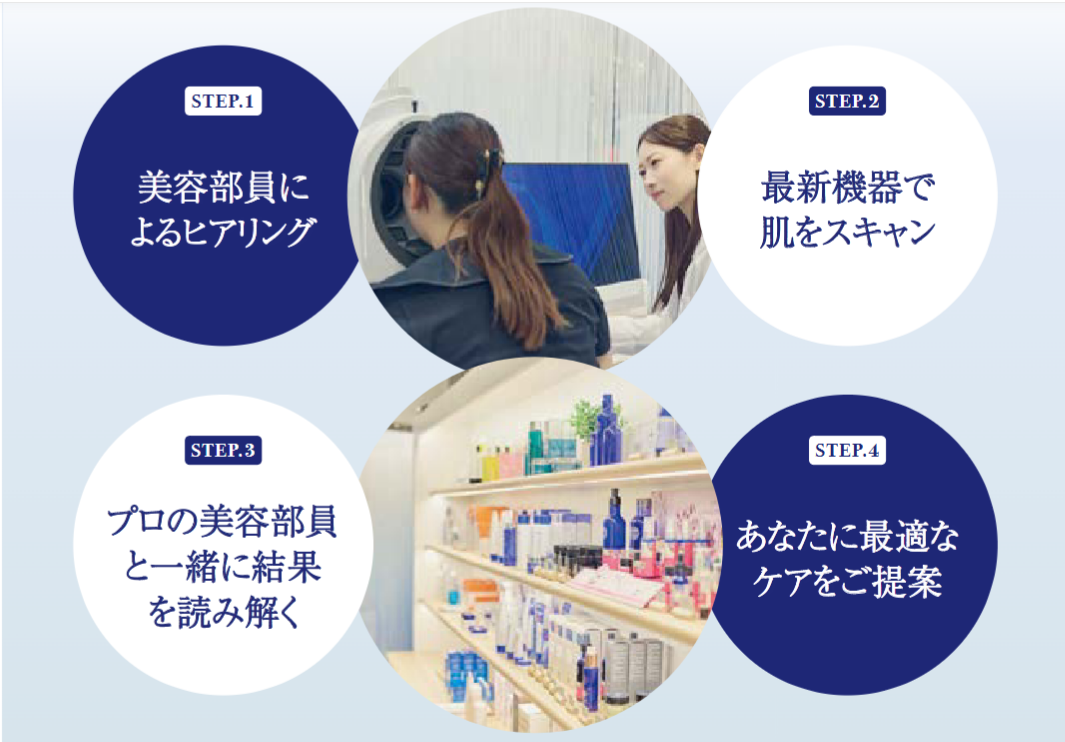 高精度肌診断機を用いて肌の状態を紐解き、お客様にぴったりのスキンケアやインナーケアを提案させていただく店舗です。