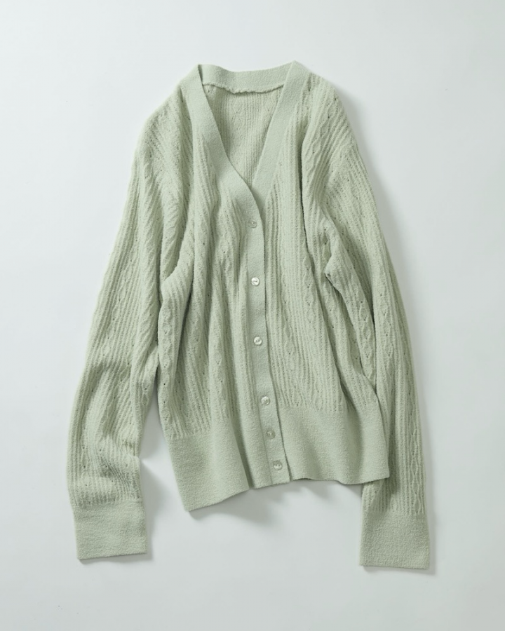 かぎ編み調の編み柄が柔らかな肌ざわりとマッチしたデザインのカーディガン。