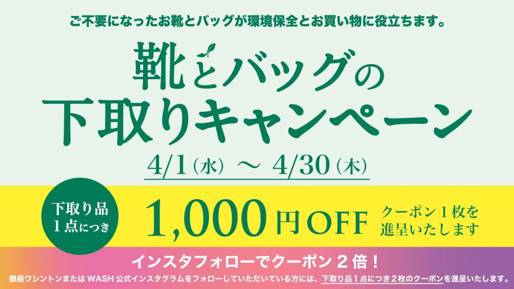 GINZA WASHINGTON阪急三番街店では4月1日(水)〜4月30日(木)の期間、〈 靴とバッグの下取りキャンペーン 〉を開催いたします。